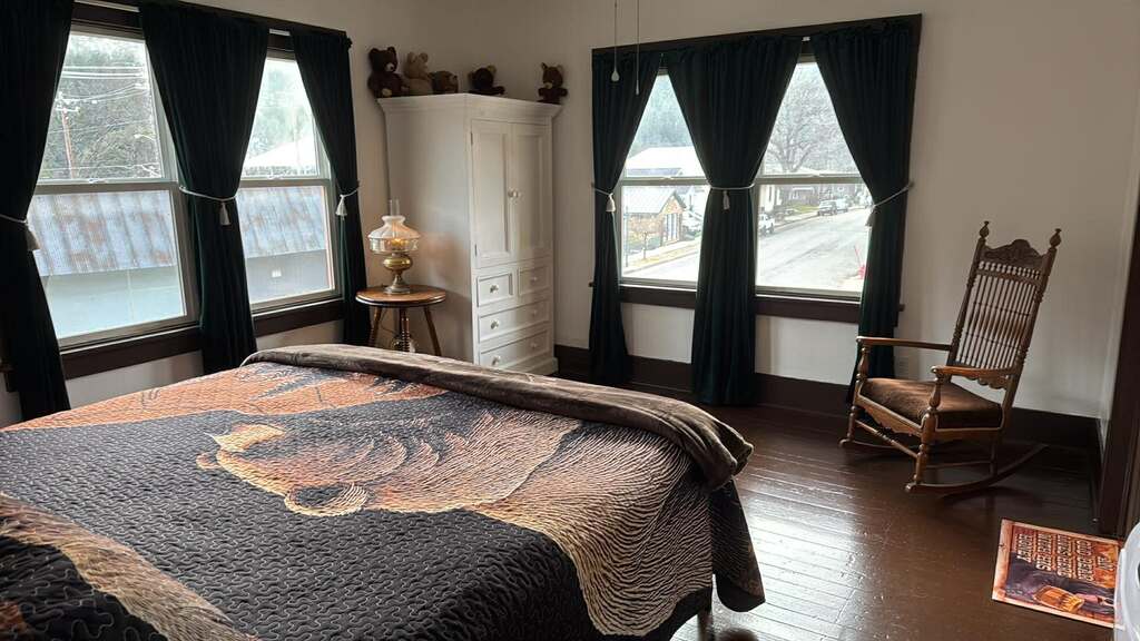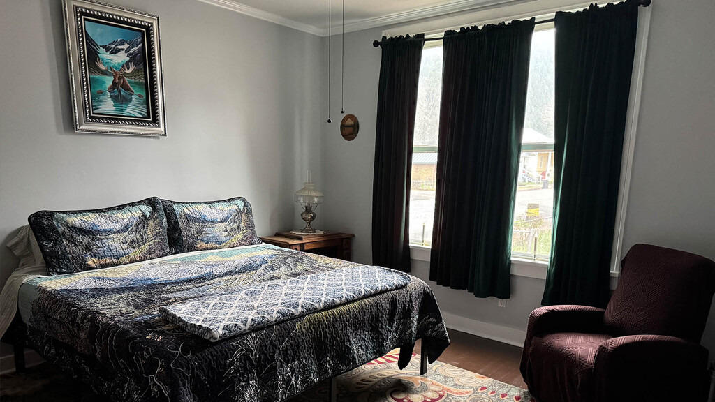 Come cuddle up with our brown furry friends of the Northwest in our Bear Room. This corner layout room is bright with 4 large windows offering a view of Dunsmuir Ave. Shower in your own private bath or soak your weary feet in the claw foot tub.