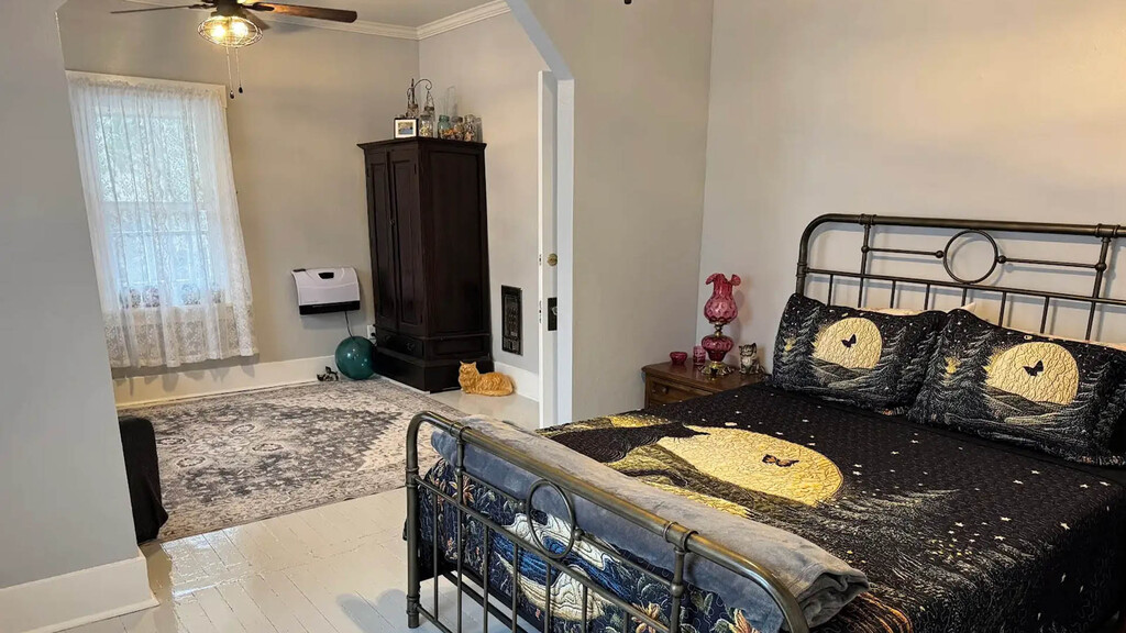 Named for a young lady who was our first guest after we built our first Bed and Breakfast. It's the purr-fect place to cuddle into bed for feline lovers of every kind. Ceramic kitties adorn the space which features a seperate seating area and private bathroom.